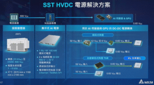 但是从英伟达和台达的技术发展路线图来看,“边柜”方案可能是过渡性方案。因为英伟达公布的800V架构是在2027年实施,并将回到集中式电源机柜方案,即通过模块化固态变压器(SST)机柜和HVDC服务器电源,将800V直流电压在机架级降至50V直流母线电压。