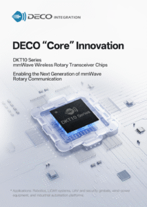 Shenzhen, China — November 2025 —DECO Integration Technology Co., Ltd. (“DECO”) today announced the release of its new DKT10 Series mmWave Wireless Rotary Transceiver Chips, designed for data and control links in high-speed rotating systems. The series targets a broad range of applications, including robotics, LiDAR, UAV and security gimbals, wind turbines, and industrial automation platforms. As a chip-level mmWave communication solution, the DKT10 Series is among the few offerings in the industry capable of delivering rotary wireless links in mass-production form.